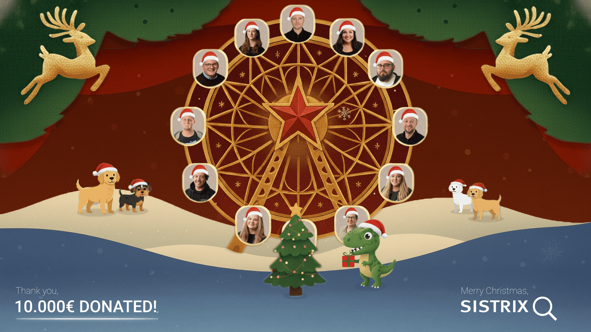 With every click on the green button, the SISTRIX Christmas Big Wheel spins live in the stream. Not only will you be doing something good, but you’ll also get a glimpse behind the scenes. Colleagues from our Bonn office will regularly take a seat in front of the camera and wave to you.