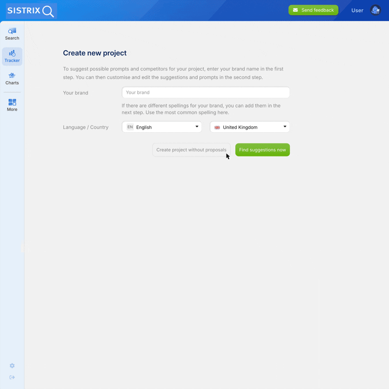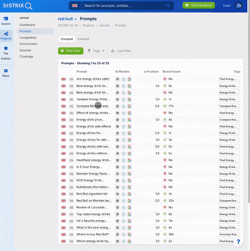 AI search engines don’t provide fixed rankings, but rather dynamic results. This makes it all the more important to know if and how your brand appears in them. Projects can help you regularly monitor this visibility and keep track of changes.