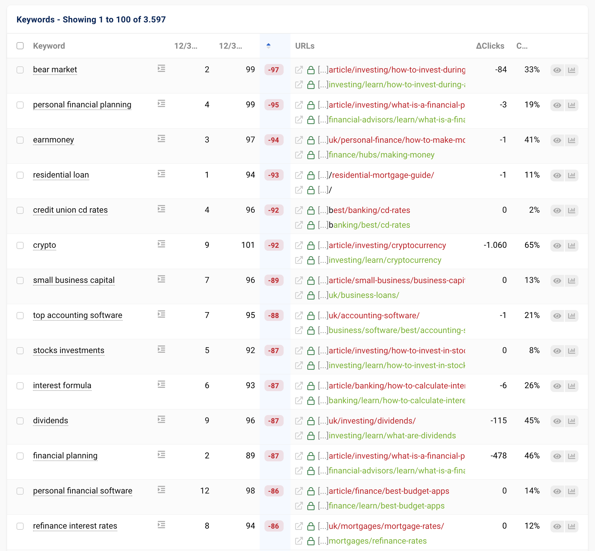 A deeper analysis of the “investing” section reveals a stark contrast over the last 12 months: articles in this category experienced ranking declines or losses for 25,391 keywords, compared to only 7,890 keywords that improved or were newly ranked.