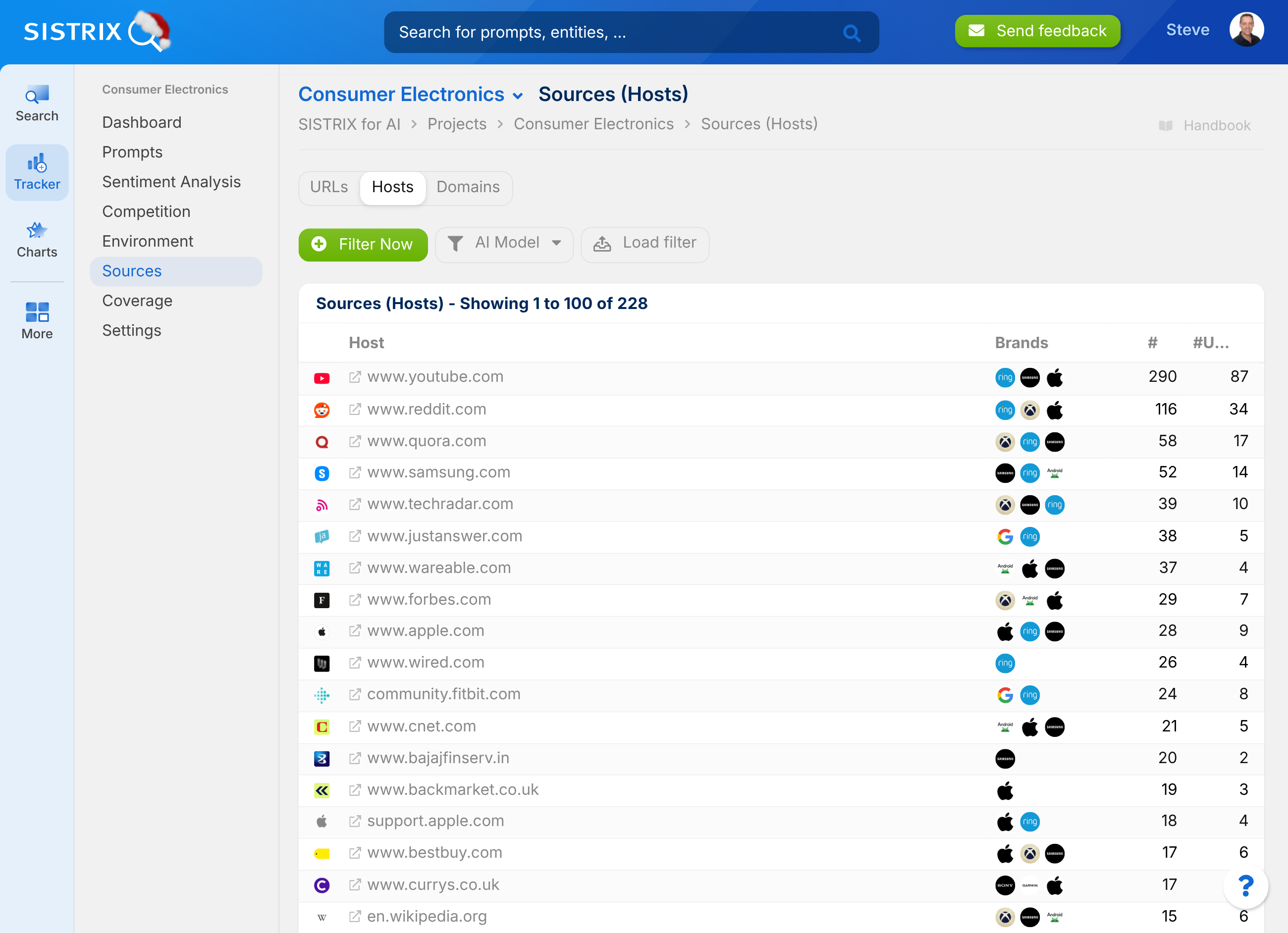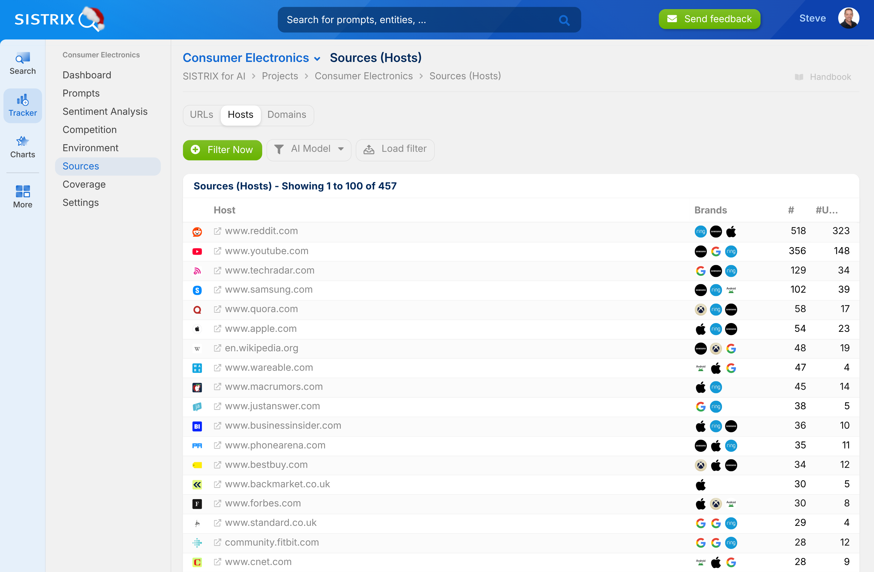 For the first time in a Visibility Leaders project we are using data from Chatbots. The SISTRIX for AI tool is still in beta but the data is stable and provides us an opportunity to research this important reference point for visibility. Note: Since this report was created, SISTRIX has added new chatbot sources to the data. The data here is based on measurements for linked website sources in the answers to 100 prompts, sourced from the People Also Asked questions seen in the SERPs for the project keyword set.