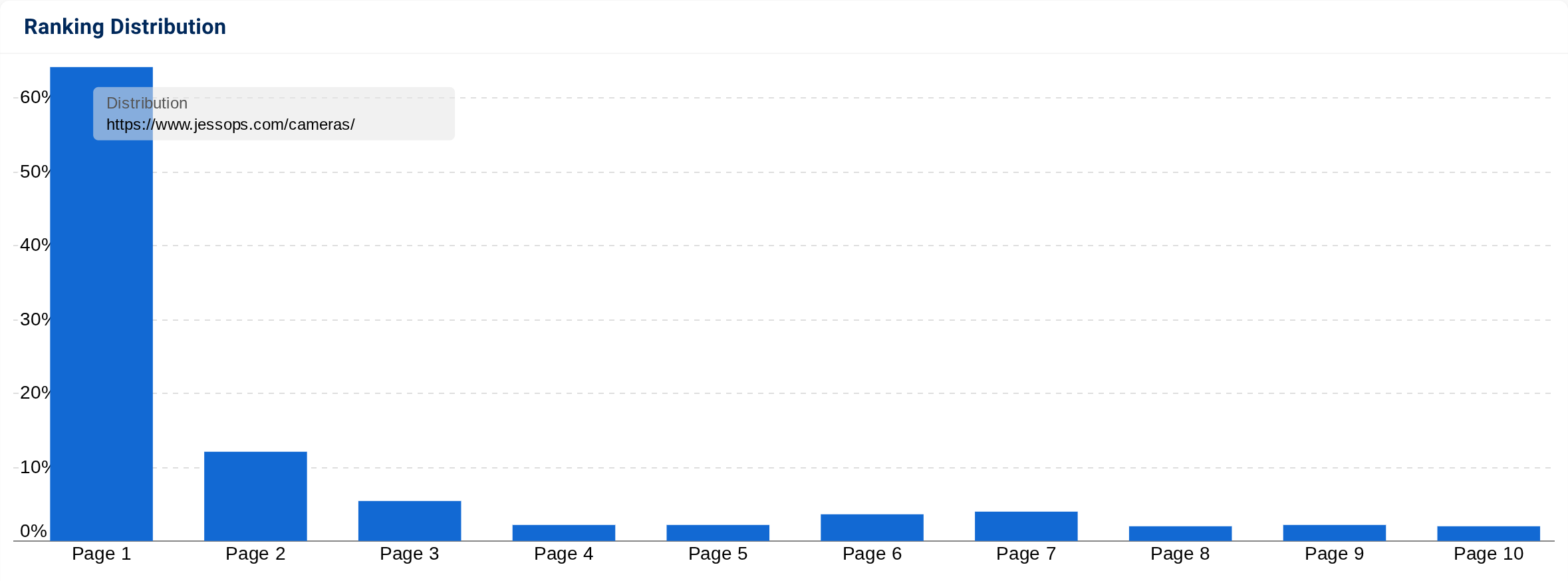 Their /cameras/ directory ranks for 4,493 keywords in the UK currently, with over 60% of those rankings appearing on page one of Google. This is an important indicator that the directory is well-targeted and well-ranked by Google, giving it a ‘high performance’ status.