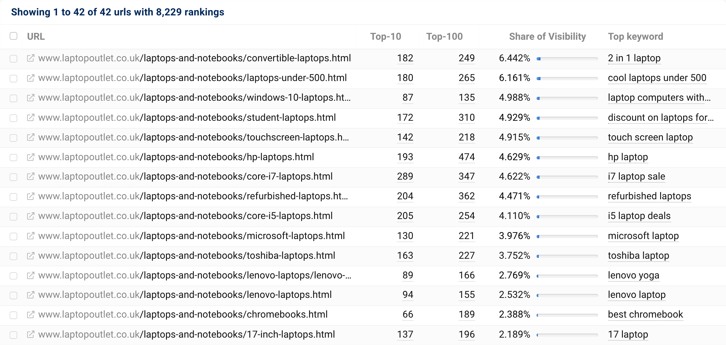 The ranking distribution performace (above) is strong with with 36% of 8339 rankings on page one of Google. As with Jessops, LaptopOutlet’s URLs in this directory are all PLPs.